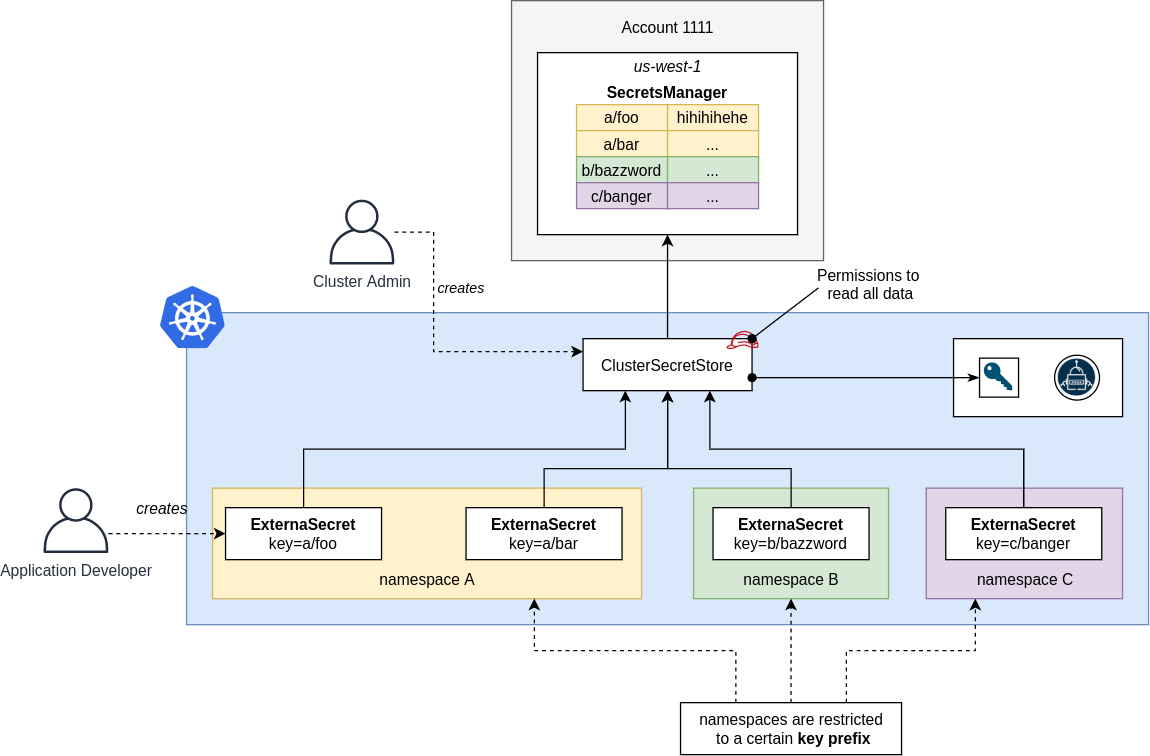 A Cluster Administrator deploys a ClusterSecretStore (CSS) and manages access to the external API. The CSS is shared by all tenants within the cluster. Application Developers do reference it in a ExternalSecret but can not create a ClusterSecretStores or SecretStores on their own. Now all application developers have access to all the secrets. You probably want to limit access to certain keys or prefixes that should be used. ESO does not provide a mechanic to limit access to certain keys per namespace. More advanced validation should be done with an Admission Webhook, e.g. with Kyverno or Open Policy Agent).